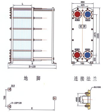 框架包括一個固定壓緊板和一個活動壓緊板,由上導桿與下導桿支承,在另‘端有一支柱。壓制成的波紋板片懸掛在兩板之間的上導桿上,移動活動壓緊板將板片組壓緊,再用一組夾緊螺柱將固定壓緊板和活動壓緊板夾緊至一定尺寸。兩種介質(zhì)經(jīng)固定(或活動)壓緊板上法蘭孔流入由波紋板片組成的各自通道,熱交換后介質(zhì)再由固定(或活動)壓緊板上的法蘭孔流出。同定壓緊板、活動壓緊板、支柱及導桿均為低碳鋼??紤]到用戶的多種使用要求,框架設計有多種型式,主要有雙支撐框架式和常用的落地式等,也可根據(jù)用戶的要求更改框架的型式。